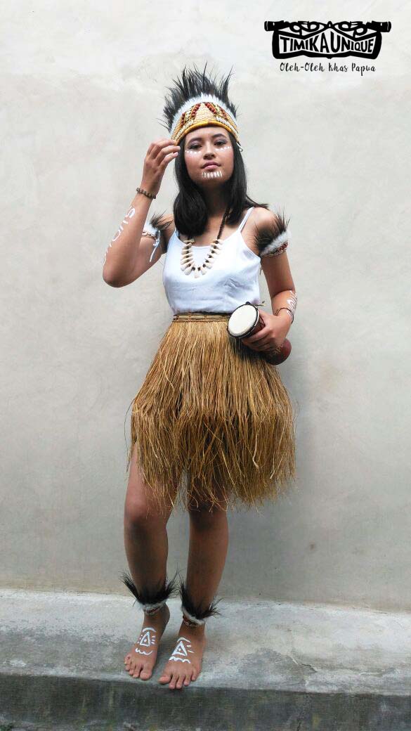 Baju Adat Papua terdiri dari Topi Adat, Kalung Gigi Sapi, Gelang Lengan dan Kaki, Rok rumbai dan sepasang gelang Wamena. Jika membeli satu paket lengkap memang mahal karena sebanding dengan isinya. Namun Anda tidak perlu kuatir karena isi dari Paket bisa dibeli terpisah. Artinya Anda bisa membeli rok rumbainya saja atau topi adatnya saja, ataupun kalungnya.
